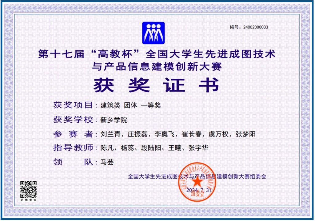7月29日,第十七届“高教杯”全国大学生先进成图技术与产品信息建模创新大赛在贵州大学圆满落幕,此次大赛为84项全国普通高校大学生竞赛目录之一,共有895所院校的16000余位选手参与,涵盖了建筑类、水利类、道桥类等多个专业领域。yl23411永利官网登录陈凡、杨蕊、段陆阳、张宇华等8名教师和李奥飞、刘兰青、庄振磊等7名学生组成的参赛团队在此次大赛中再创辉煌,荣获建筑类团体一等奖,分赛道一等奖2项,二等奖2项,三等奖5项。